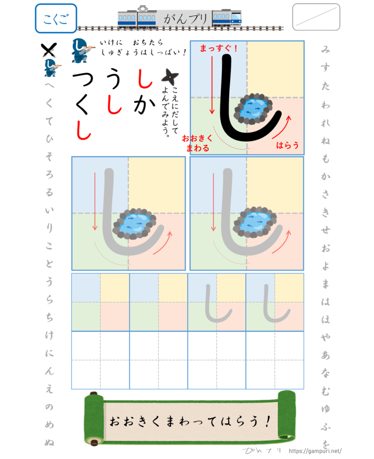 ひらがな「し」のかきかたプリント|無料ダウンロード