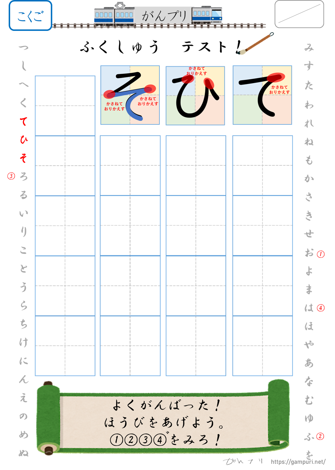 「重ねて折り返す基礎編」グループの「て」「ひ」「そ」の復習です。