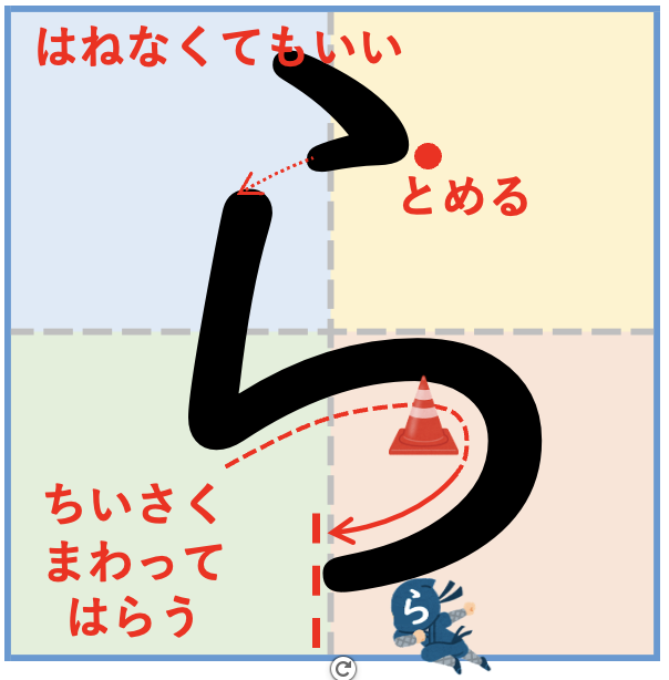 「ら」は、丸みと折り返しの動きを組み合わせた文字です。
