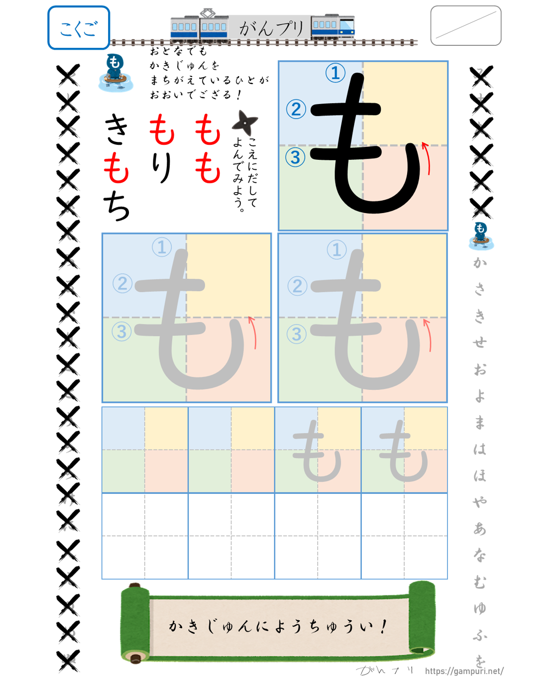 ひらがなかきかた【も】 2022 7/07 がんプリ国語 ひらがなかきかた 入学準備 未就学児 2022年7月7日2023年10月11日 当ページのリンクには広告が含まれています。 書き順が間違えやすい「も」。「し」が1画目です!! Download Now! 次のプリント ひらがなかきかた【か】 3画目を広くあけるのは、バランスをとるためです。逆に広げすぎないようにも注意が必要ですね…! ひらがなプリント一覧はこちら 【無料ダウンロード】遊びのように学ぶ ひらがなの書きかた練習プリント ひらがなの練習をプリントでさせようとしても…お子様が途中で挫折してしまうことありませんか?または、小学校入学前に、もう少しひらがなを上手に書いてもらいたいと思… がんプリ国語 ひらがなかきかた 入学準備 未就学児 よかったらシェアしてね! URLをコピーしました!