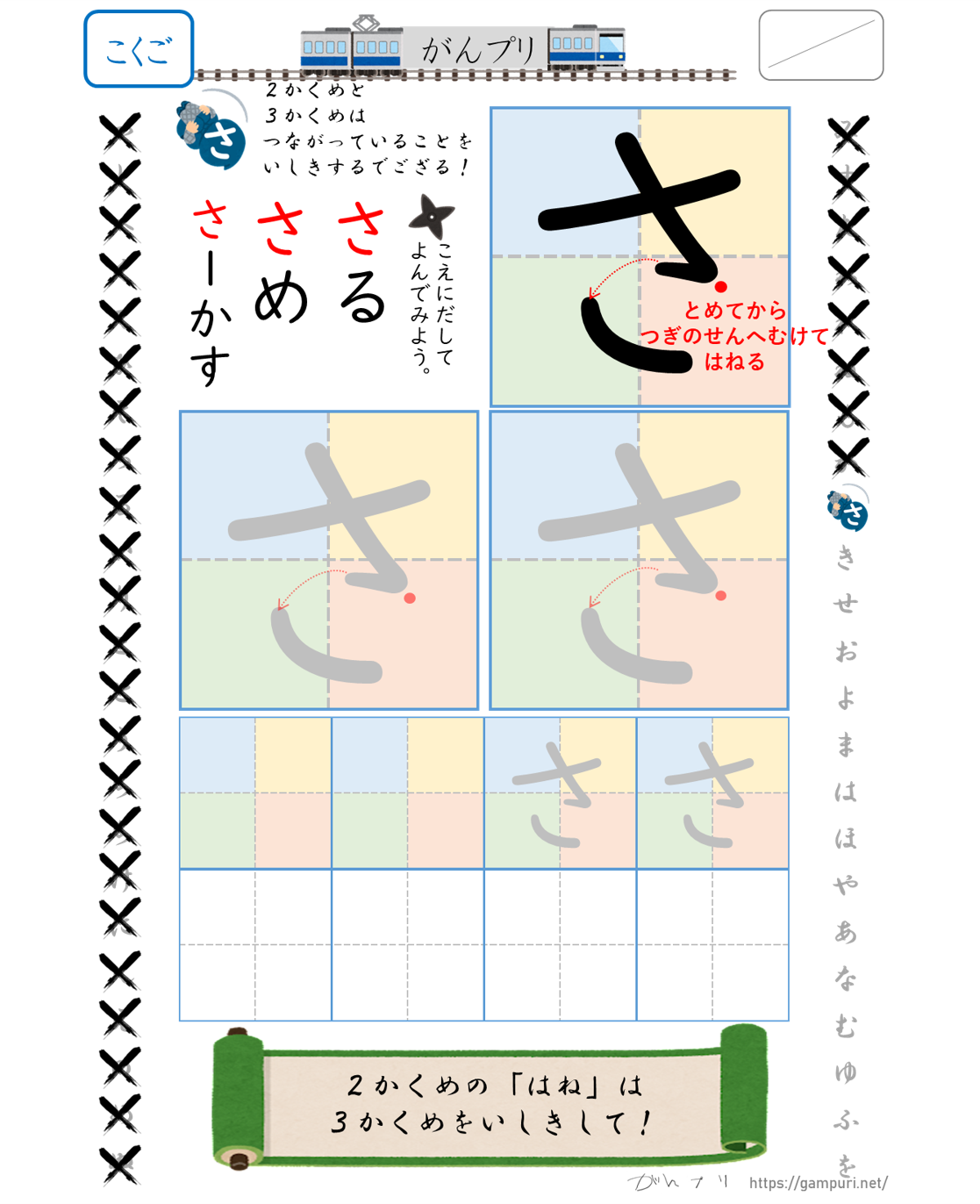 ひらがなかきかた【さ】 2022 7/09 がんプリ国語 ひらがなかきかた 入学準備 未就学児 2022年7月9日2023年10月11日 当ページのリンクには広告が含まれています。 「とめて次にむけて跳ねる!」定番ですね! Download Now! 次のプリント ひらがなかきかた【き】 ひらがなプリント一覧はこちら 【無料ダウンロード】遊びのように学ぶ ひらがなの書きかた練習プリント ひらがなの練習をプリントでさせようとしても…お子様が途中で挫折してしまうことありませんか?または、小学校入学前に、もう少しひらがなを上手に書いてもらいたいと思… がんプリ国語 ひらがなかきかた 入学準備 未就学児 よかったらシェアしてね! URLをコピーしました!